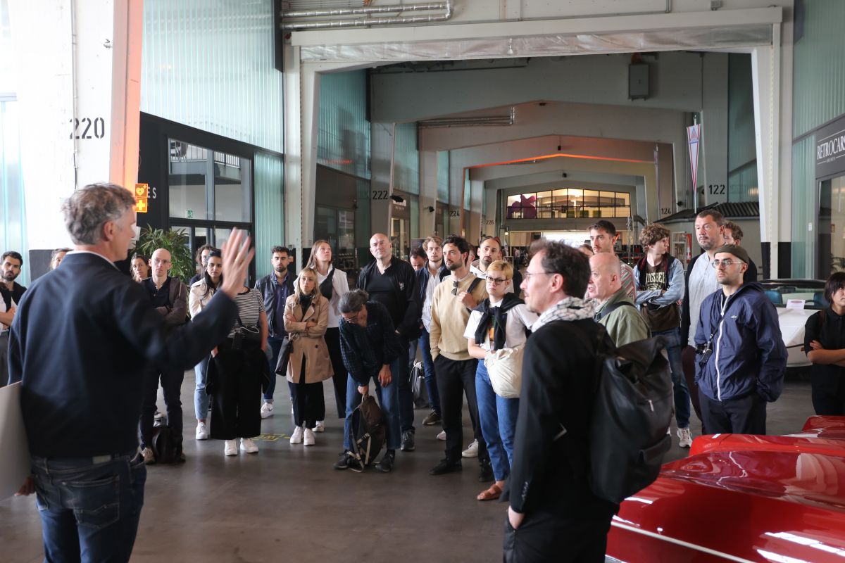 Mitten hinein ins Spannungsfeld zwischen Stadtgeschichte und Neuentwicklung zielte auch die nächste Besichtigung. Im Zuge der Konversion der alten Hafenreviere wurden in das ehemalige Logistikgebäude „Schuppen Eins“ ein Automobilzentrum und Büroeinheiten, aber auch Wohnungen integriert, wobei das besondere Flair der ehemaligen Zweckarchitektur zu erhalten war. Der Architekt Jost Westphal führte durch das mehrfach ausgezeichnete Haus, das sein Büro 2013 umgebaut hatte.