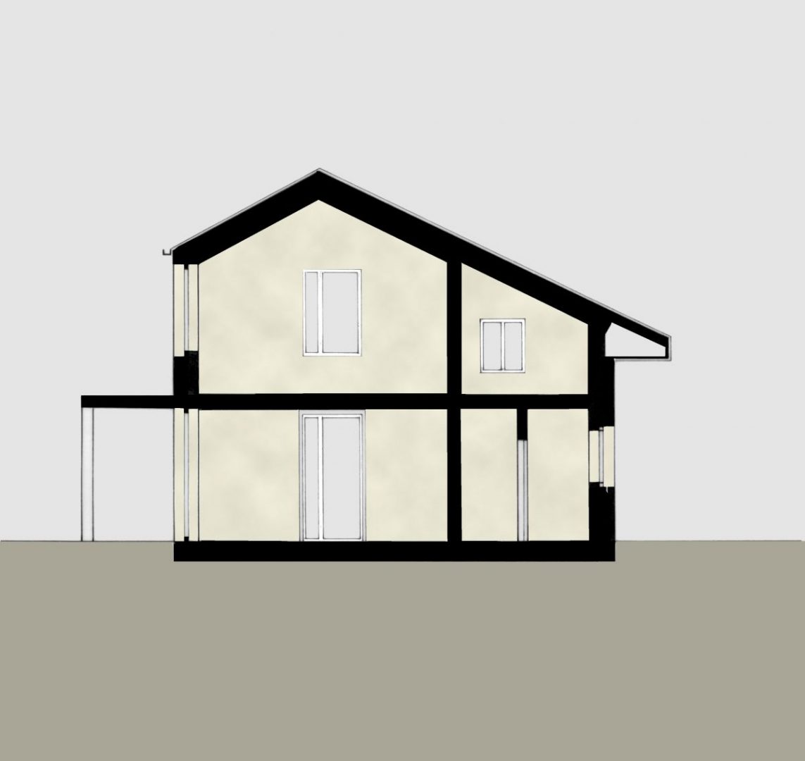 Anstelle eines heruntergekommenen Anwesens, das aus unterschiedlichsten Erweiterungen bestand, sollte ein Einfamilienhaus mit circa 300 qm Wohnfläche entstehen. Das Grundstück liegt im Außenbereich. Es war eine wesentliche Auflage der Genehmigungsbehörde, die ursprüngliche Firsthöhe und die Gebäudebreite und -länge gegenüber dem alten Haus nicht zu verändern. Um ein auf der Gartenseite im Obergeschoss gut belichtetes Haus zu erhalten, wurde die Firstlinie nach Süden verschoben. Dadurch war es möglich, bei gleichbleibender Firsthöhe zwei ausreichend hohe Geschosse zu bilden. Es entsteht ein asymmetrisches Satteldach, das mit seinem einseitigen Dachüberstand eine Anlehnung an Typologien sucht, die in der Region gebräuchlich sind.