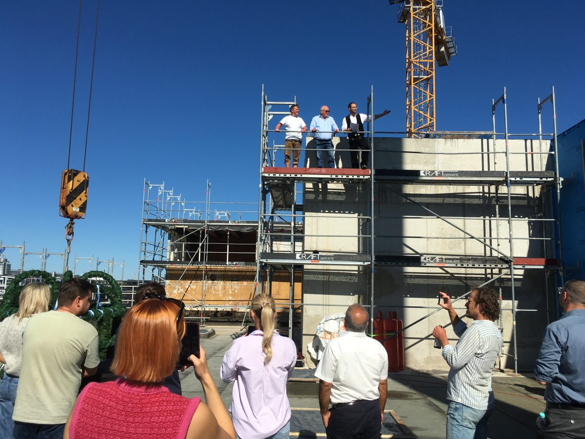 Trotzdem fehlte es nicht an Zimmerleuten auf der Baustelle. Schließlich wird die Aufstockung des Bauteils B, einer der ehemaligen Produktionsstätten, ganz in Holz ausgeführt. Das neue Wohngeschoss besteht vom Tragwerk bis zur Außenwand aus dem nachwachsenden Rohstoff. Und so verkündete mit Zimmerermeister Zeno Stolz ein echter Fachmann den Richtspruch. Sein Gruß galt der Bauherrin (links von ihm Werner Eckart, OTEC), dem Architekturbüro Hild und K, den übrigen Planungsbüros (ganz links Simon Beis, Holz 100), der Bauleitung, den Genehmigungsbehörden und allen beteiligten Firmen.