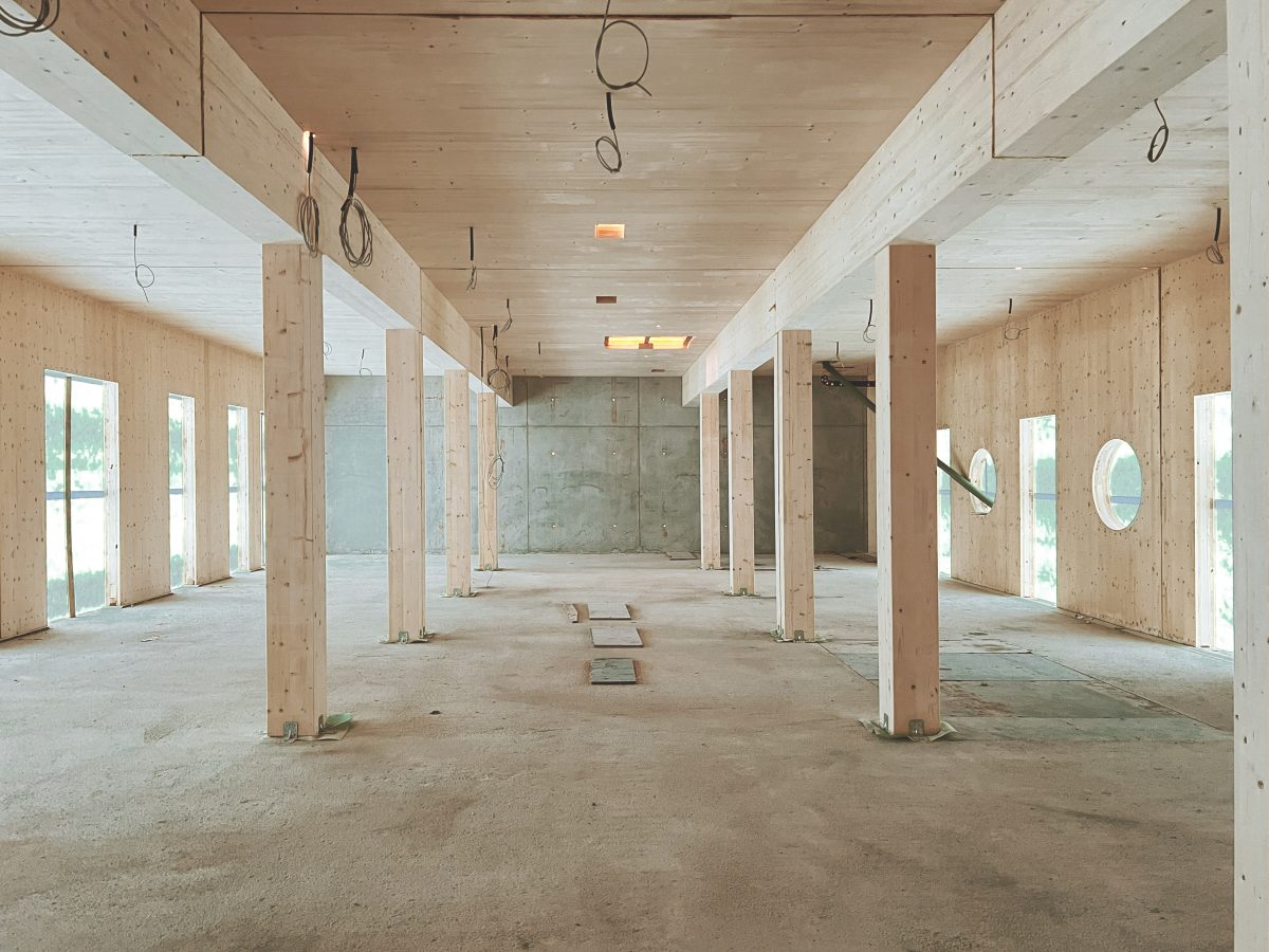 Der Umbau des ehemaligen Fabrik- und Verwaltungsgebäudes der Firma Pfanni zu Wohnungen, Büros, Gewerbeflächen und zwei Kitas ist mittlerweile so weit fortgeschritten, dass die Bauherrin OTEC zum Richtfest laden konnte. Diese Feier, traditionellerweise als Anerkennung für die Handwerksleute zum Abschluss der Rohbauerstellung ausgerichtet, verdankt ihren Namen dem Aufrichten des Dachstuhls. Heute sind solche geneigten Tragwerke, zumindest im städtischen Raum, längst nicht mehr die Regel. Auch das Werk 1 wird seine Flachdächer behalten.